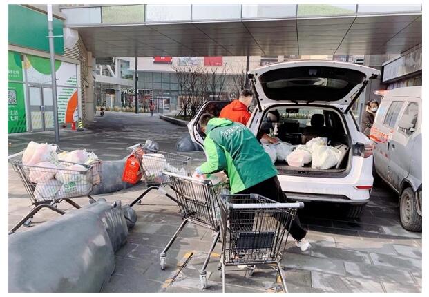 发现问题后,七鲜超市迅速响应进行调整。一方面装车时,配送员会用马克笔在每个塑料袋上标注收货地址的详细单元号及门牌号。另一方面,有两名店员身穿防护服长期驻守在社区门口,负责卸货并放在各栋楼对应的购物车内。这对于社区志愿者来说的确是帮了大忙,一个小动作却大大的增加了送货效率。