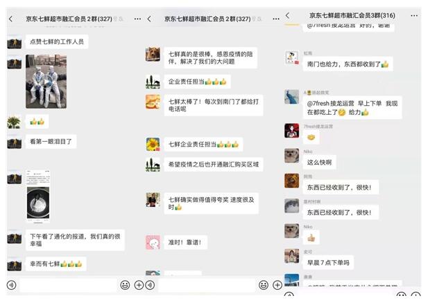 为了更及时地了解社区居民的需求,“七鲜社区微信群”也相继建立。短短一上午时间,四、五个500人大群相继加满。群内居民的声音传递着感动和鼓励,这也让七鲜超市一线员工感受到一切辛苦和坚持都是值得的。