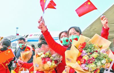 援鄂医疗队航班于14时40分许到达首都国际机场,在滑行中“过水门”,享受民航界最高礼遇。停机坪上,“向新时代最可爱的人致敬”等横幅海报,向医疗队表达敬意。迎接仪式结束后,14辆车头披挂着红花的大巴车载着医疗队队员,在雄壮的乐曲声中,在亲人同事的欢呼声中,缓缓驶离机场。