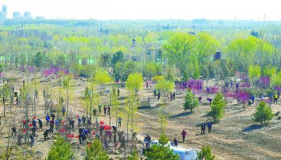 同一天,通州区以“水韵林海、千年绿城”为主题在张家湾镇举行大型全民义务植树活动。来自全区各机关事业单位的干部职工900余人在这里种下油松、海棠、丁香等乔木和花灌木3000余株。这块植树地属于城市副中心环城景观生态林建设范围。原先是一处工厂,后由乡镇腾退用于生态建设。未来这里将呈现“森林四季分明,湿地春秋华彩”的景观特色。