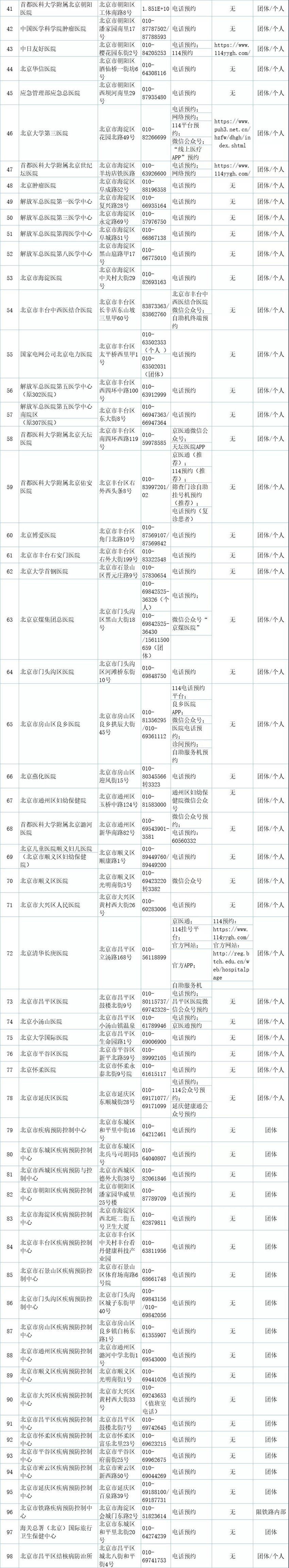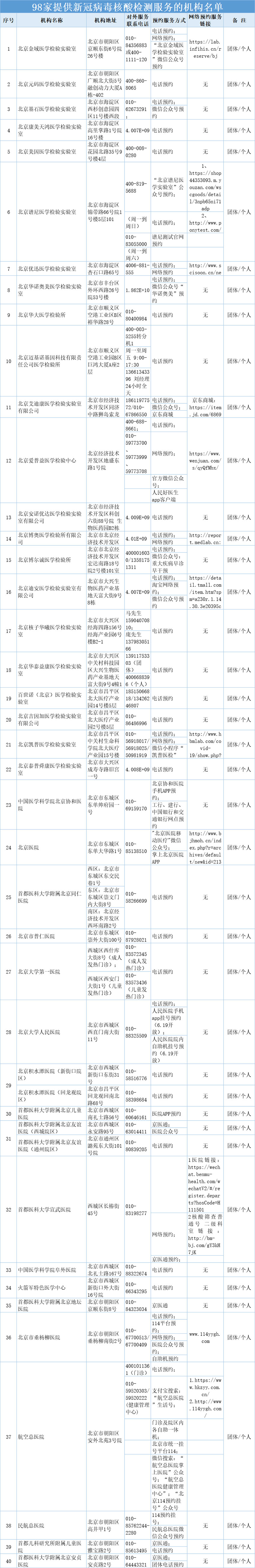 据北京市卫生健康委员会消息,4月15日、5月11日,北京市分别公布了46所和21所,面向团体和个人提供新冠病毒核酸检测服务的医疗卫生机构。截至6月13日,北京市又新增31家具备核酸检测能力的医疗卫生机构,可面向团体和个人提供新冠病毒核酸检测服务。目前北京市具备核酸检测能力的机构达到98所,每天最大检测能力已达9万多人。根据防控工作需要,为便于群众预约查询,北京市卫生健康委员会汇总了检测机构的网络预约链接和APP、微信公众号等信息。现将面向社会团体和个人提供新冠病毒核酸检测服务的98所医疗卫生机构名单予以公布,有检测需求的单位和个人,请提前进行预约。