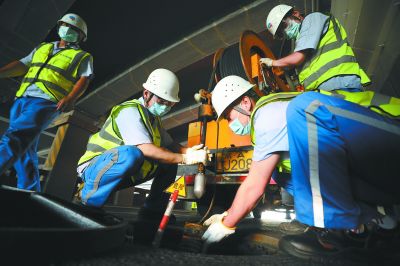 本周末,本市将迎来雷阵雨天气,市排水集团一分公司根据预报启动三级响应。今天上午,一分公司小型排水抢险单元的防汛备勤人员对复兴门下凹桥区进行排水设施养护检查工作,为应对即将到来的主汛期做好准备。 本报记者 饶强 摄
