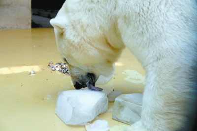 冰块在夏日是必不可少的降暑神器,当日气温达到35℃以上时,北京动物园饲养部门就会给北极熊、棕熊、大熊猫、小熊猫、金丝猴、黑猩猩等动物运送冰块,帮助降温。“每块冰二三十斤重,要在冷库里冻上3天才能冻好。”饲养员说,每次给动物们送去冰块,它们都“爱不释手”。为了让食草动物们在降温的同时补充水分和糖分,增加反应训练,工作人员还会将日常水果和冰块一起冷冻,做成“果冰”,并且拴上草绳,悬挂起来,让动物自主取食。除了提供多汁的蔬果,饲养员还会根据不同时期动物所需,提供绿豆汤、果蔬冰等解暑食物,随时调整饲料,保障动物能量的供给需求及营养需要。