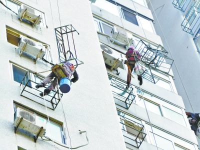 石景山区八角街道建钢南里社区住宅楼外立面上,十余年的空调外挂机护栏锈蚀严重,有断裂、脱落的隐患。街道和社区经过多方协调和沟通后,开始陆续拆除空调外挂机护栏。本报记者 吴镝摄