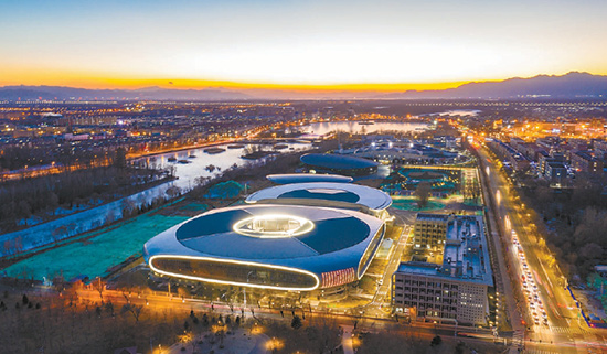 妫水河畔,北京市冰上项目训练基地亮灯。 本报记者 潘之望摄
