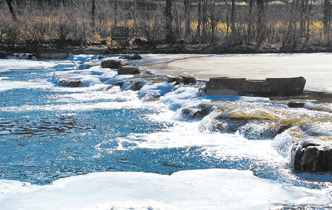 1月3日,京郊门头沟王平村,冬季生态补水后的永定河仿佛银色的长龙在山谷中蜿蜒盘旋,开裂冰面的声响回荡在峡谷间。 本报特约摄影 樊甲山