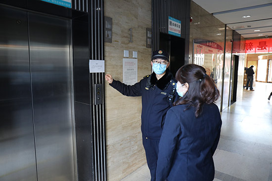 丰台马家堡综合行政执法队检查商务楼宇疫情防控。