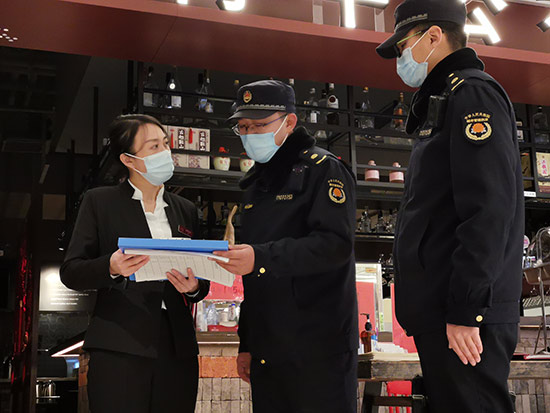 1月5日下午,丰台城管执法局联合卢沟桥乡综合执法队对一处商场开展拉网式检查。执法人员对商场入口及场内商户北京健康宝的扫码情况、体温检测情况、消杀情况等相关记录逐项查看,对商场工作人员正确佩戴口罩情况、商场通风换气等措施的落实情况逐项进行检查。检查中,执法人员对工作人员自身防疫措施到位、及时提醒顾客带好口罩等行为予以肯定,并再次向商场管理者及商户宣传防疫知识,要求相关负责人履行职责,将防疫工作落实到位。