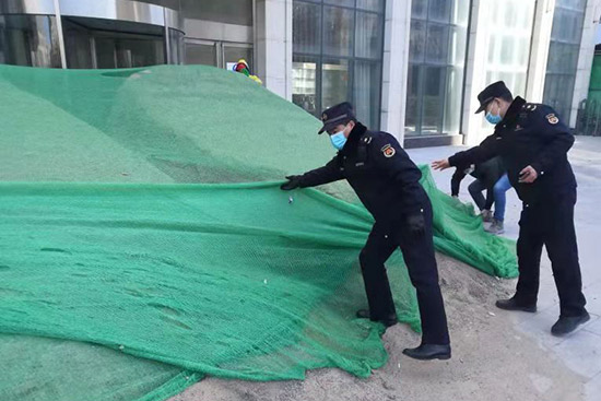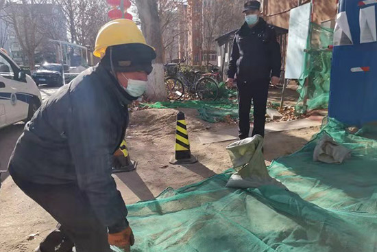 在梅源社区附近,东高地街道综合执法队来到一处施工现场,发现绿色防尘网没有苫盖完全,浮土被风吹起。执法队员立即找到负责人,他表示风太大把苫布吹开了,附近的工人没有及时发现。执法人员现场要求其立即整改,并再次宣传告知了相关施工规定,强调大风黄色预警天气,要停止土石方作业,及时对裸露处进行覆盖,加强巡查,发现苫盖破损及时补盖压实。