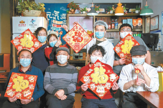 响应国家号召,在北京经营鄂菜馆的湖北襄阳人聂玉华决定在京过年。在她的带动下,餐馆的5名外地员工也将就地过年。聂玉华一家三口和员工们一起手拿福字拍下一张不一样的团圆照,小小的餐馆里,喜气洋洋。 本报记者 潘之望摄
