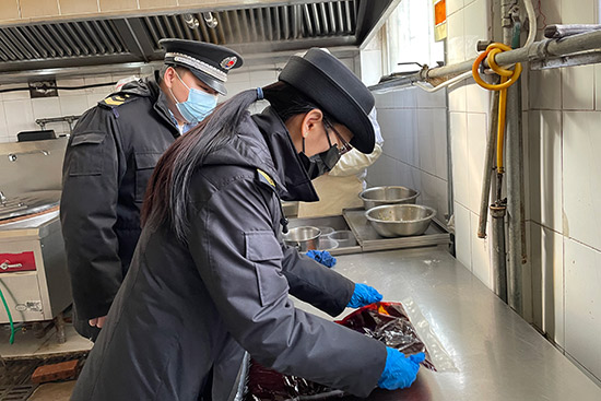 在上锁的留样冰箱里,工作人员按规定把每餐的饭菜都取样125g装在密闭容器内冷藏存放48小时。同时,按照当前疫情防控要求,从业人员健康管理档案里详细记录了工作人员的晨午检体温监测情况以及返京人员的核酸检测结果。此外,执法人员仔细查看了库房、冰箱、操作间内贮存食品的感官性状、保质期情况,督促工作人员彻底清查库存食材原料、调味品等,及时清除过期、变质食材原料和调味品。现场还对进货查验的落实情况进行了检查,查看了索证索票、进货查验和台账记录情况,确保实现全链条闭环追溯。