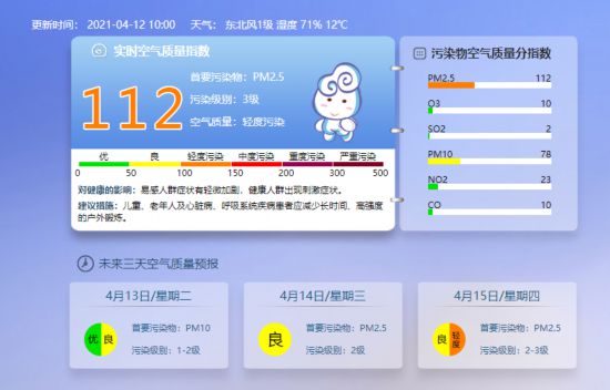 据北京市生态环境监测中心网站发布,截至4月12日上午10时,北京实时空气质量指数为112,处于轻度污染水平。除顺义、通州空气质量为2级良外,其他14区均出现PM2.5轻度污染。