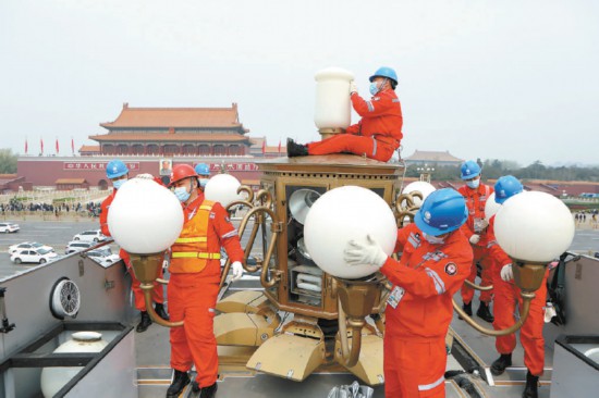 昨天,第五代华灯车驶入天安门广场,国网北京电力城市照明管理中心华灯班成员开始对天安门广场和长安街上的253基华灯、6000多盏光源全面“体检”。
