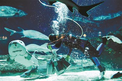 在国宝中华鲟馆,北京青年报记者看到,潜水员拿着十几个饭盒潜游喂食,向中华鲟喂食鱼等食物,整个喂食过程持续将近半小时。