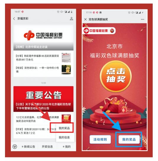 3.特别说明关于扫码抽奖后奖品查询的办法,在扫描票面二维码进入活动应用后,点击下方“我的奖品”按钮进入详情页,查看抽奖和中奖记录,进行中奖信息登记。另外,也可在京福京彩公众号底部菜单栏“我的”—“我的奖品”处点击进入。具体操作如下:
