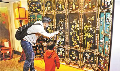 4月5日,国家级非物质文化遗产金漆镶嵌技艺系列活动之匠心漆韵――金漆镶嵌技艺精品展在北京开幕。展览展出了金漆镶嵌工艺美术大师柏群、王学兵、李德伦、米春雷的《仿清宫戗金彩绘百宝嵌方角柜》《清乾隆八吉祥福寿百宝嵌六扇屏风》《鸟语花香》等30多件高品质漆艺精品和百余件金漆镶嵌文化创意作品。展览荟萃了工艺美术大师和非遗代表性传承人的经典力作,以及金漆镶嵌青年设计师的创新作品。文/本报记者 郭佳 供图/新华社