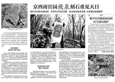 据北青报记者了解,发现“w泉”的南官园地区,以摩崖石刻密集著称。《北京市第三次文物普查资料汇编》显示,清代南官园刻石群,位于门头沟区中门寺沟西部山区,系区级文物保护单位。因风景秀丽、巨石磊磊,南官园吸引了众多文人墨客,并在巨石上镌刻诗文,目前发现的摩崖刻字有“乐静山庄”“待月崖”“古烟霞”“听涛”“卧游”“武陵春色”等等,楷、行、篆、隶各字体均有,被誉为京西书法艺术水平最高的摩崖刻石群。但在官方资料中,北青报记者并未看到关于“w泉”的记载。